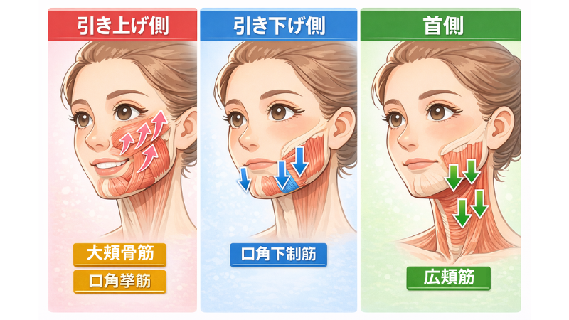 ・引き上げ側:頬〜口元を上げる筋肉(大頬骨筋、口角挙筋など)